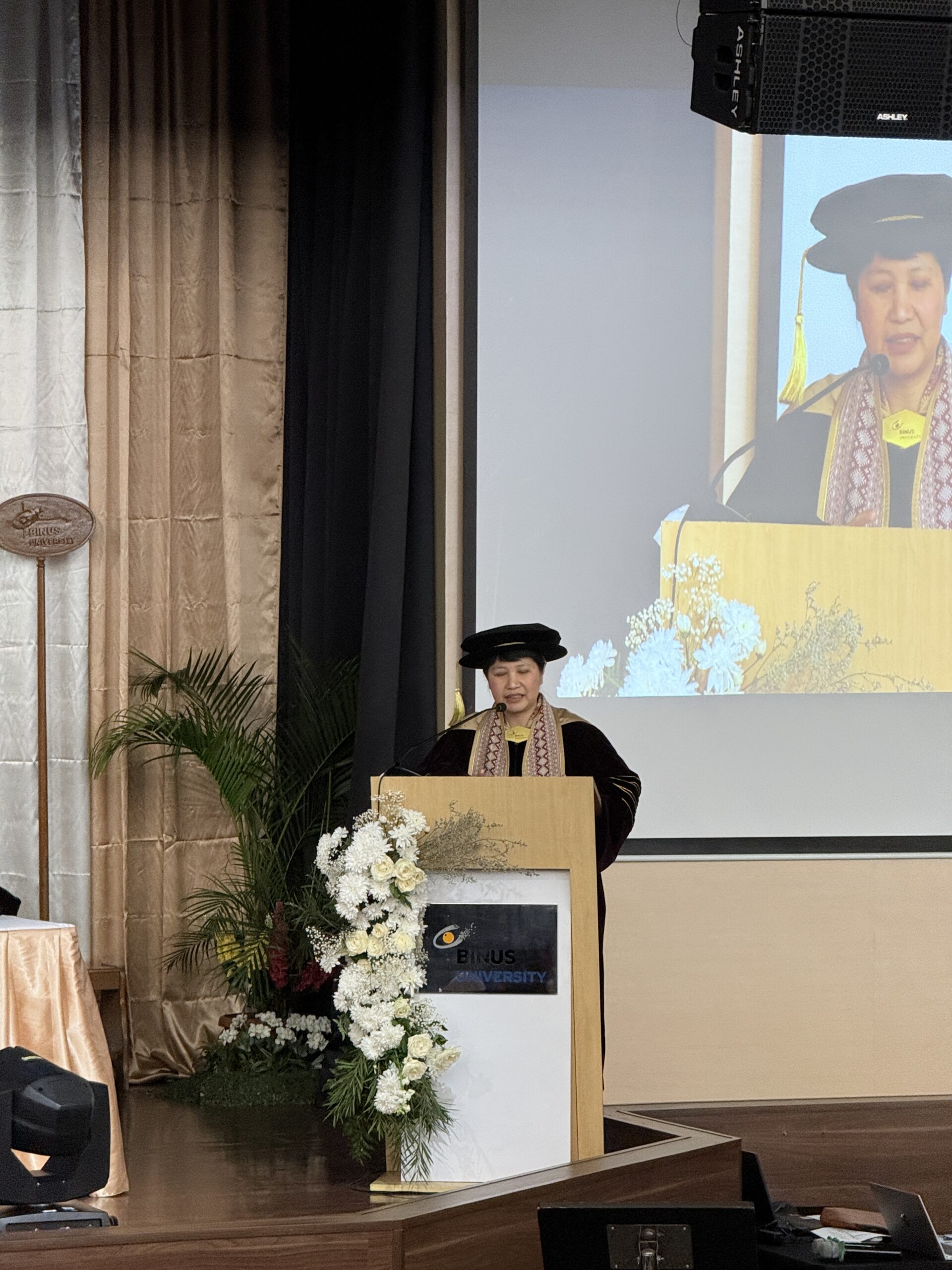 Acara dimulai dengan pembacaan doa agar acara hari itu dapat dijalankan dengan lancar. Dilanjut dengan sambutan kepada pada tamu yang sudah datang ditempat maupun menonton secara daring dari Rektor BINUS University, Dr. Nelly. S.Kom., M.Kom. M.M., CSCA. Setelah Ibu Nelly menyelesaikan dilanjut dengan sambutan dari Prof. Dr. Engkos Achmad Kuncoro, S.E., M.M. atau yang lebih sebagai Prof. Kun membuka dengan ucapan selamat kepada Prof.