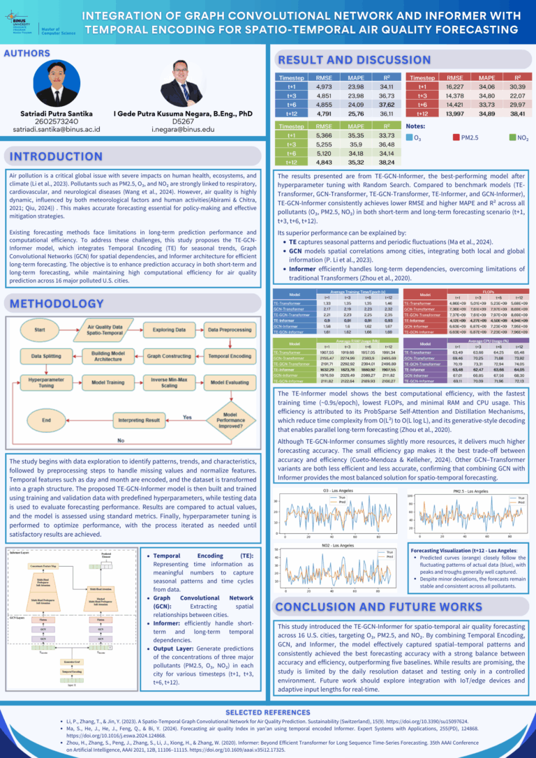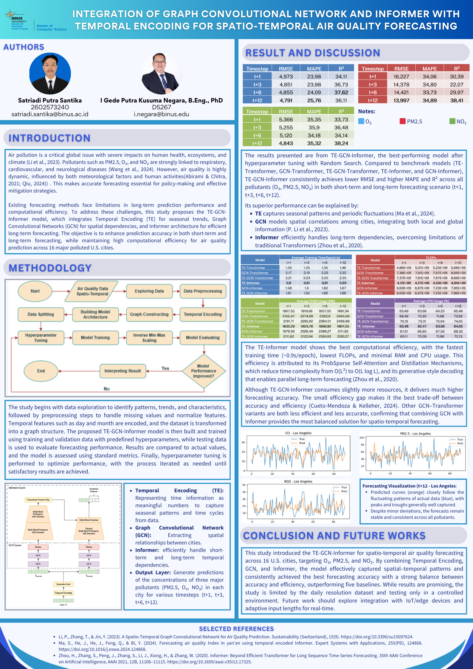 Air quality is one of the most critical environmental issues due to its significant impact on human health and the environment. One possible approach to address this problem is forecasting, which plays an important role in mitigating the effects of pollution by predicting future pollutant concentrations. This study proposes the TE-GCN-Informer model, which combines Temporal Encoding, Graph Convolutional Network (GCN), and Informer to perform spatio-temporal forecasting of three major pollutants (PM2.5, O₃, and NO₂) across 16 cities in the United States. The main contribution of this research lies in integrating seasonal, spatial, and temporal representations into a unified theoretical framework, thereby extending the understanding of how these three aspects can be effectively combined to enhance forecast performance while maintaining computational efficiency. The dataset consists of daily air pollution data from January 1, 2019, to December 11, 2020, along with additional features including pollutants, meteorological variables, population, and traffic. Experiments were conducted on four forecasting scenarios, namely t+1, t+3, t+6, and t+12, using RMSE, MAPE, and R² as evaluation metrics. The results show that TE-GCN-Informer consistently outperforms other baseline models in both short-term and long-term forecasting. The model produces lower errors and higher forecasting performance in almost all scenarios. In addition to forecasting performance, computational efficiency was also analyzed through training time, FLOPs, RAM usage, and CPU consumption. The results demonstrate that the proposed model is more efficient than Transformer-based models. Overall, TE-GCN-Informer proves to be an accurate and efficient approach for both short-term and long-term air quality forecasting