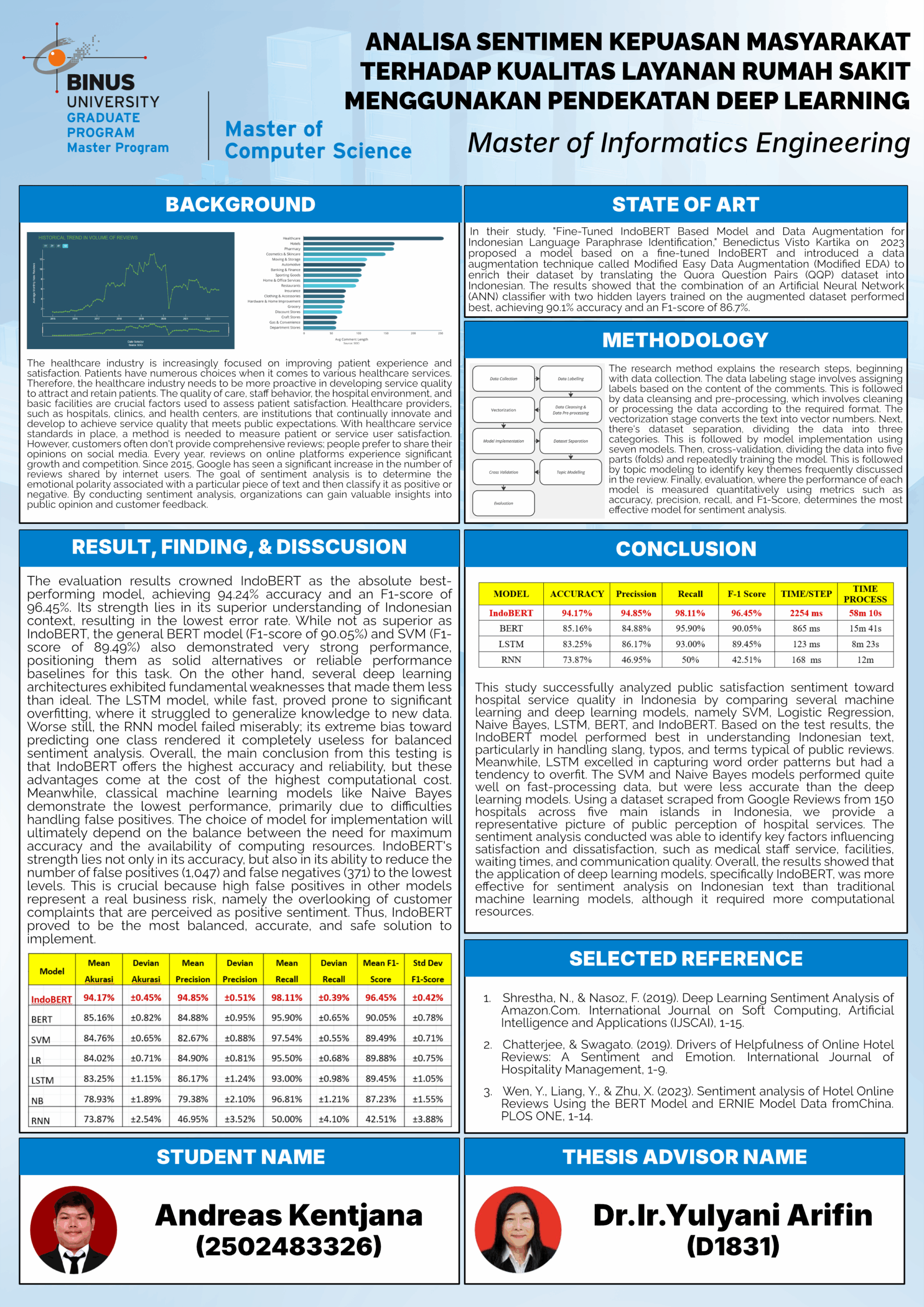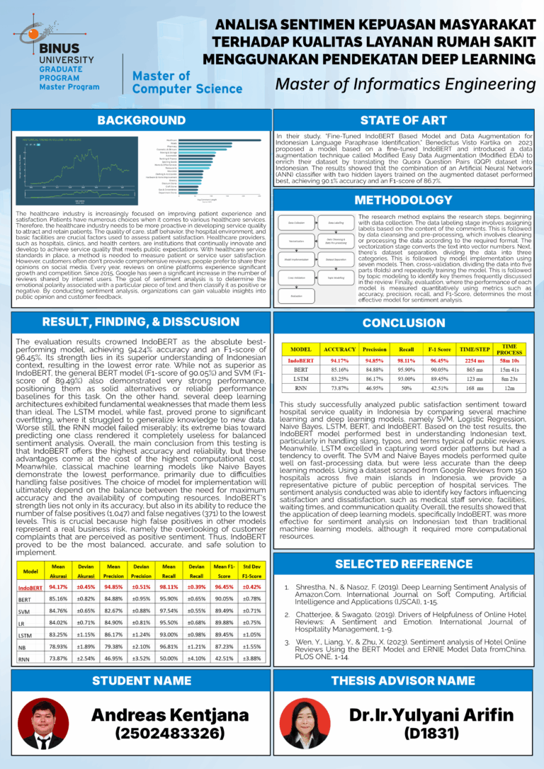 Industri layanan kesehatan saat ini semakin berfokus pada peningkatan pengalaman dan kepuasan pasien, mengingat masyarakat memiliki beragam pilihan layanan kesehatan. Oleh karena itu, penyedia layanan seperti rumah sakit dituntut untuk terus meningkatkan kualitas layanannya agar kepercayaan pasien tetap terjaga. Seiring kemajuan teknologi digital, opini publik kini banyak disampaikan melalui platform daring seperti Google Reviews, yang merupakan sumber data potensial untuk menganalisis persepsi publik terhadap layanan kesehatan. Penelitian ini bertujuan untuk menganalisis sentimen publik terhadap kualitas layanan rumah sakit di Indonesia menggunakan pendekatan Natural Language Processing (NLP) dan machine learning. Data ulasan dikumpulkan dari Google Reviews dan diklasifikasikan ke dalam kategori positif dan negatif. Metode yang digunakan dalam penelitian ini meliputi metode machine learning tradisional dan Deep Learning yang masing-masing memiliki keunggulan dalam memahami struktur bahasa dan konteks teks. Hasil penelitian ini diharapkan dapat berkontribusi dalam peningkatan kualitas layanan kesehatan melalui pemanfaatan teknologi analisis sentimen, serta memperkaya literatur di bidang NLP dengan fokus pada implementasi IndoBERT di sektor kesehatan.